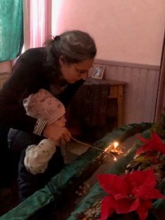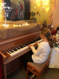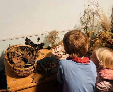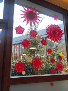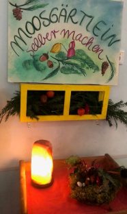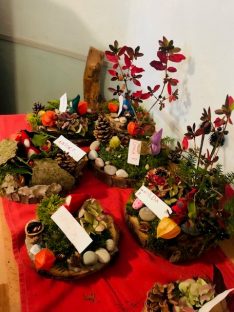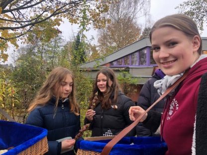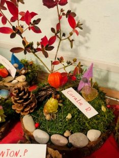 Bevor das traditionsreiche, stimmungsvolle Fest allerdings beginnen konnte, hatten sich zahlreiche fleißige Eltern, Erzieherinnen, Lehrende, Schülerinnen und Schüler gemeinsam einen ganzen Tag lang mächtig ins Zeug gelegt, um das Schule und Gelände einer wunderbaren Verwandlung zu unterziehen: Tannenbäume wurden gleich im Dutzend von Hängern geladen und auf dem Schulhof aufgestellt, dazu haufenweise Tannengrün und Herbstlaub dekoriert, wochenlang gesammelte Waldfrüchte wie Kastanien, Zapfen, Eicheln und Lampionblumen wurden körbeweise geschleppt, Schubkarren voll Mulch und Rinde geschaufelt sowie Baumstämme in allerlei Größen platziert. Viele emsige Helferinnen und Helfer verteilten Windlichter, selbstgebastelte Laternen und Kerzen auf dem Schulhof, drapierten leuchtend rote Weihnachtssterne und Äpfel auf duftendem Tannengrün oder hellem Moos, schmückten die verschiedenen Schulhäuser mit bunten Wimpeln und liebevoll gebastelten Transparentpapier-Szenerien und malten farbenfrohe Wegweiser.