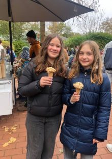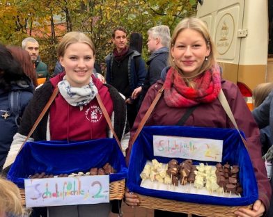 Auf dem Schulhof herrschte ein entspanntes Sich-Treiben-Lassen zu stimmungsvoller Musik, wobei besonders an den Stehtischen des Barister-Mobils viele Eltern und Marktbesucher mit schmackhaften Kaffeespezialitäten in anregende Gespräche vertieft waren. Und wer nach vielerlei Aktivität eine Stärkung brauchte, konnte unter diversen kulinarischen Angeboten wählen, wie z.B. knusprig heißer Pizza aus dem schuleigenen Steinofen unter freiem Himmel, zahlreichen Kuchen und Torten im Märchen- bzw. Ehemaligen-Café, frischen Waffeln und duftendem Popcorn auf dem Schulhof oder den Köstlichkeiten verschiedener Bio-Restaurants.