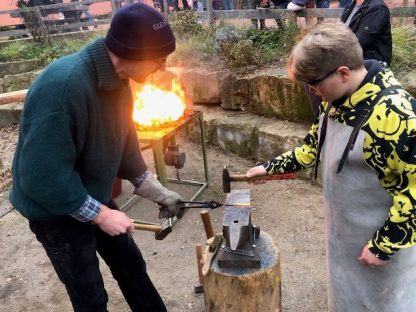 Die Kinder durften sich auch unter fachkundiger Anleitung in der Schmiede am rot glühenden Eisen ausprobieren, sodass mit jedem Hammerschlag die Funken nur so stoben. Und wer die sportliche Herausforderung suchte, durfte in der Turnhalle einen Parcours aus verschiedenen Spielstationen bewältigen oder bei der Aktion „Schlag den Lehrer“ den einen oder anderen Lehrer im Seilspringen, beim Tischtennis oder bei Korbwürfen bezwingen.
