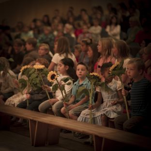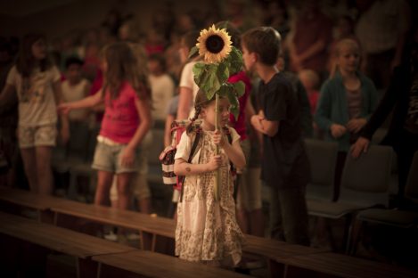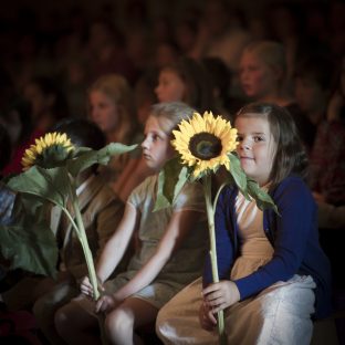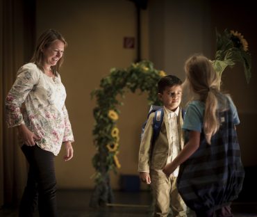 Auf der großen Bühne wagen die Kinder der neuen ersten Klasse den Schritt durch das Blumentor. Auf der anderen Seite werden sie von ihrem/r KlassenlehrerIn begrüßt und erhalten von den Zweitklässlern eine Sonnenblume. Jedes Kind hat einen Paten aus der sechsten Klasse. Sie helfen dabei sich jetzt auf der Bühne und später an der Schule zurechtzufinden.
