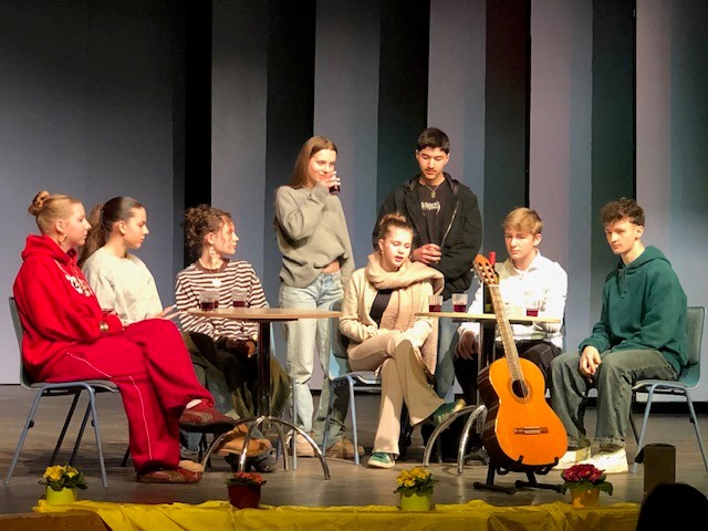 Darüber hinaus wurden auf der Bühne von einigen Klassen bzw. Fachkursen Gedichte und Sprüche rezitiert, auch gern einmal in Englisch, Spanisch oder Französisch. Dann wieder wirbelten Schülerinnen und Schüler in pastellfarbenen, hauchdünnen Gewändern mit ebensolchen Tüchern nach unsichtbarem Plan durcheinander und zeigten gekonnt Stücke aus ihrem Eurythmieunterricht.
