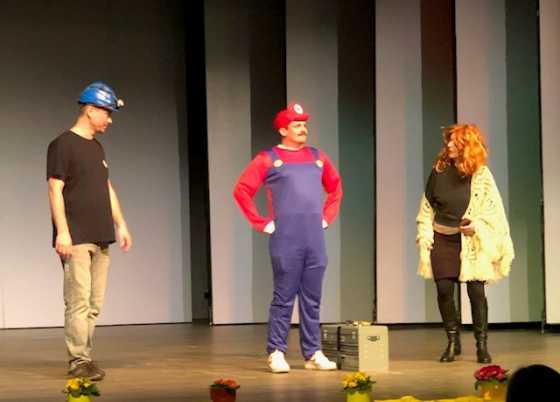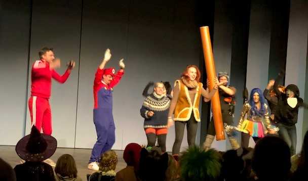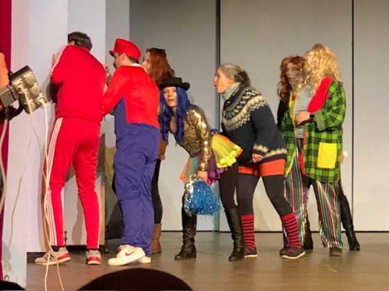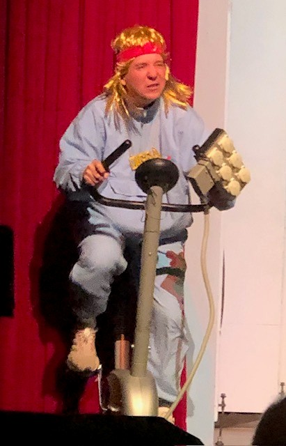 Doch im Verlauf des bunten Programms auf der Bühne konnte auch die fleißige „Körperertüchtigung“ der Lehrer auf dem Heimtrainer nicht verhindern, dass die Lage sich hinter den Kulissen immer mehr zuspitzte: Zusätzlich zum fehlenden Strom schien auch noch der Schulkeller voll Wasser zu laufen! Da war selbst Klempner „Super Mario“ ratlos…. Wie gut, dass Froschmann-Kostüm und Rettungsweste schnell zur Hand waren, sodass das muntere Faschingstreiben auf der Bühne weitergehen konnte.